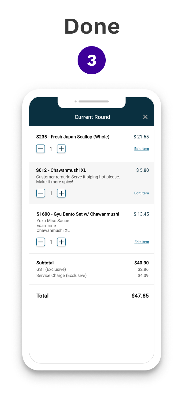 Scan, browse and checkout. Just three steps are required for your customers to place their orders on their own mobile devices. Additionally, our built-in sales functions can increase average order spending by 20%.
